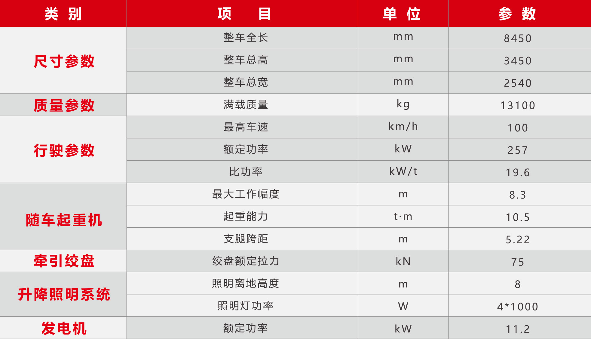 “雷沃協(xié)力”JY100/S型多功能搶險(xiǎn)救援車是我公司應(yīng)用新技術(shù)、新工藝、新材料,自主研制開發(fā)的具有自主知識(shí)產(chǎn)權(quán)的消防車,采用汕德卡原裝雙排4x2底盤改制而成。上裝核心部件均采用國內(nèi)一線品牌,配備了徐工集團(tuán)隨車起重機(jī)、Tmax牽引絞盤、濱松發(fā)電機(jī)、博燦升降照明系統(tǒng)等搶險(xiǎn)救援裝備,整車結(jié)構(gòu)布局合理,操作維護(hù)簡便,適用于地震救援、地質(zhì)災(zāi)害、交通事故、建筑物倒塌以及災(zāi)后重建等救援現(xiàn)場,是最具性價(jià)比的救援先鋒。