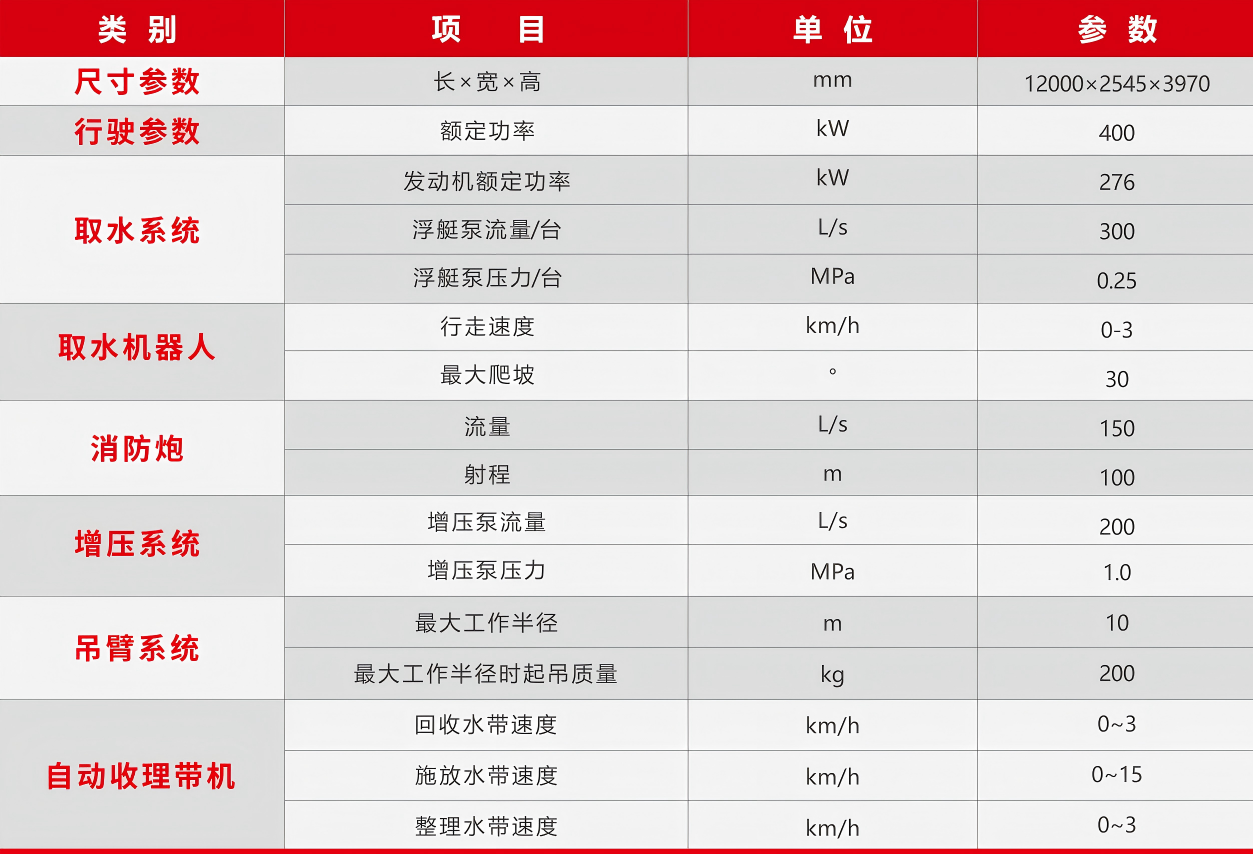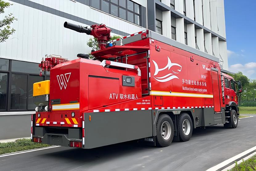 “雷沃鯨鯊”-BP200智能增壓型單車供水系統(tǒng)是我公司應(yīng)用新科技、新工藝、新材料,自主設(shè)計研發(fā)一款集滅火作戰(zhàn)與供水保障于一身的單車供水系統(tǒng),車輛采用中國重汽集團(tuán)生產(chǎn)的汕德卡6x4底盤改制而成,裝備了可遙控操作履帶式自行走取水機(jī)器人,額定流量300L/s、壓力0.25MPa的液壓驅(qū)動浮艇泵和最大工作半徑超過10米的直臂式隨車吊,同時配備150L/s大流量消防炮等裝備。該系統(tǒng)具備火災(zāi)現(xiàn)場遠(yuǎn)程供水、前線滅火,城市應(yīng)急供水及排澇救援等功能,是保障重特大應(yīng)急作戰(zhàn)行動的全能利器!