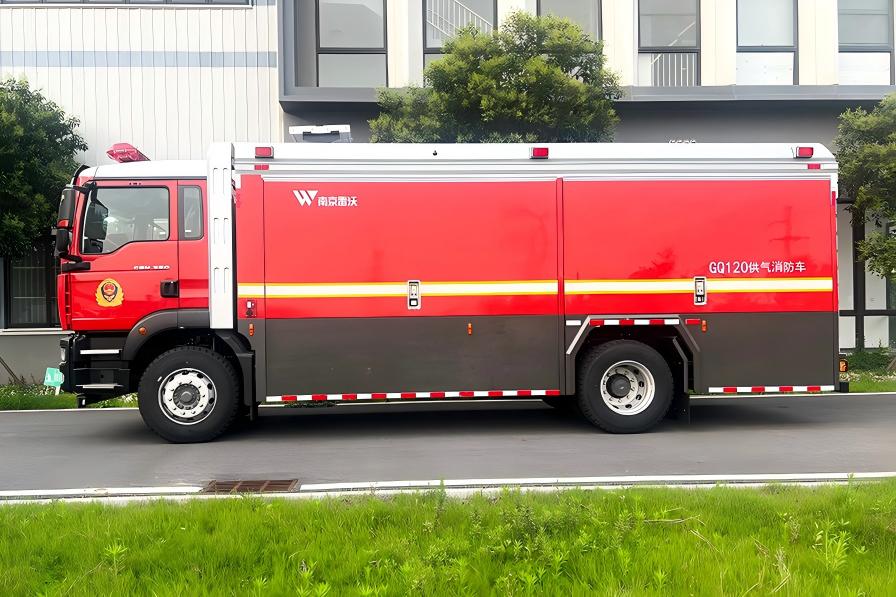 “雷沃協(xié)力”供氣消防車是我公司應(yīng)用新技術(shù)、新工藝、新材料,自主研制開發(fā)的新型供氣消防車。采用中國重汽集團(tuán)生產(chǎn)的汕德卡4×2底盤改制而成,裝備了大流量高壓空氣壓縮機(jī)、呼吸空氣凈化過濾系統(tǒng)、高壓空氣存儲(chǔ)系統(tǒng)、防爆充氣箱、智能充儲(chǔ)氣控制系統(tǒng)、升降照明系統(tǒng)等供氣裝備。該車性能強(qiáng)大、結(jié)構(gòu)緊湊、布局合理、操作簡便,非常適用于大中城市消防隊(duì)作為滅火救援現(xiàn)場的空氣呼吸器保障車使用,是移動(dòng)的供氣站!